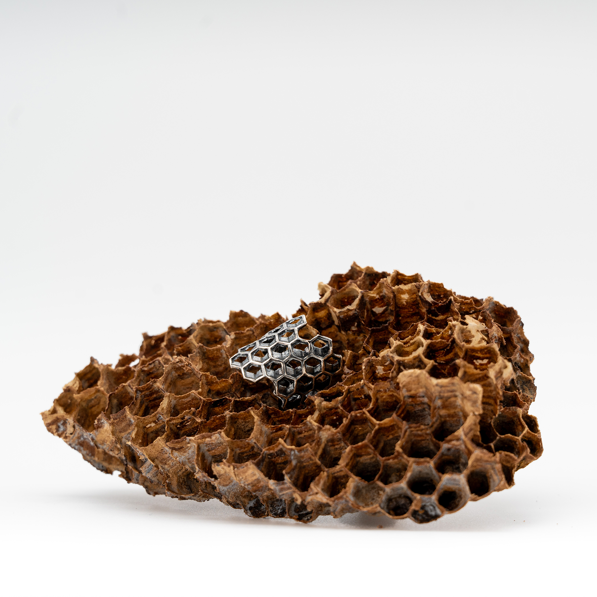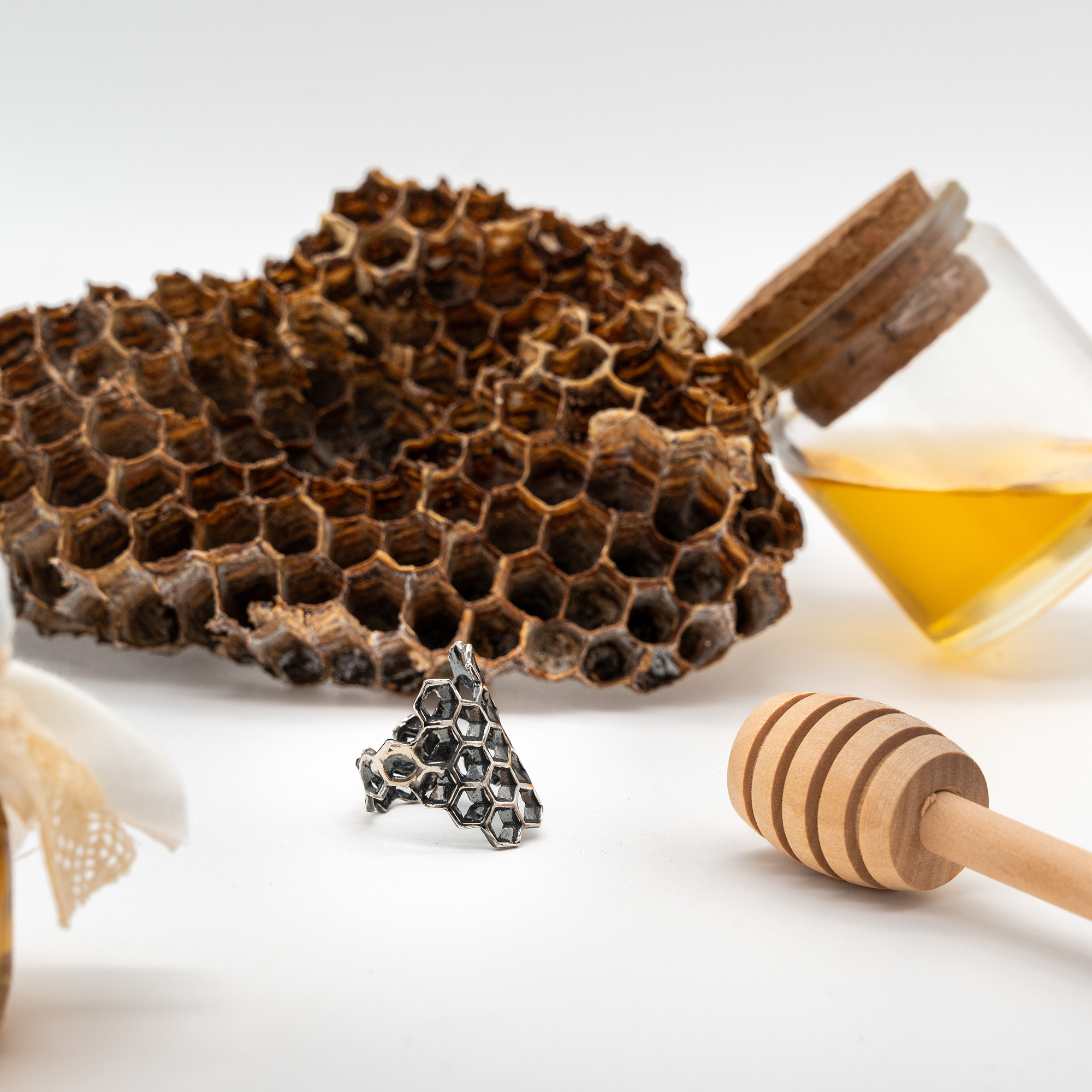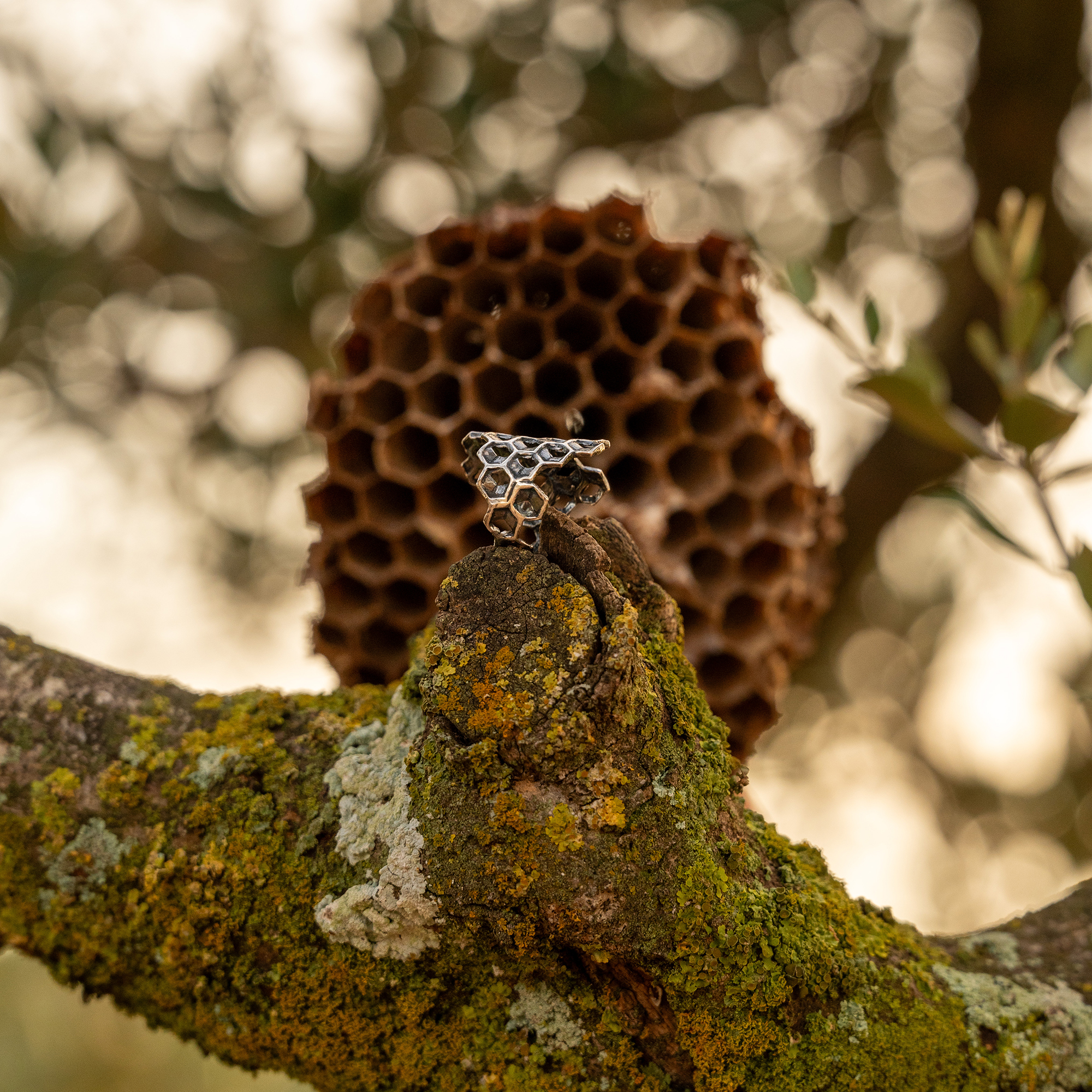 «Este anillo ancho de plata de ley rinde homenaje a la geometría perfecta del panal de abeja, un símbolo de armonía y equilibrio en la naturaleza. Su diseño envolvente y textura hexagonal crean un juego de luces y sombras que realza su belleza y carácter único.