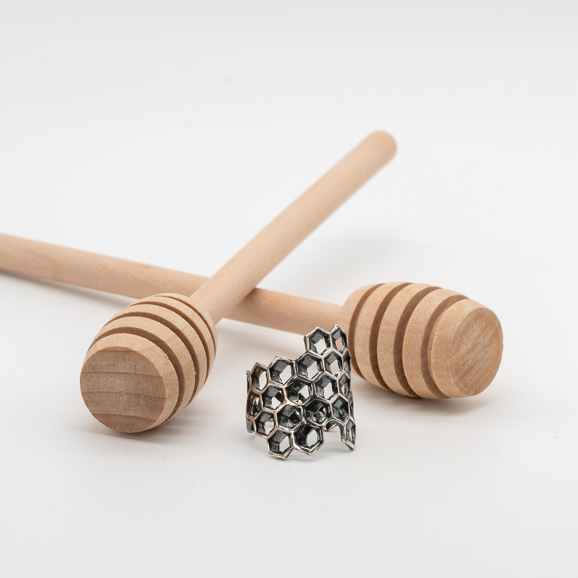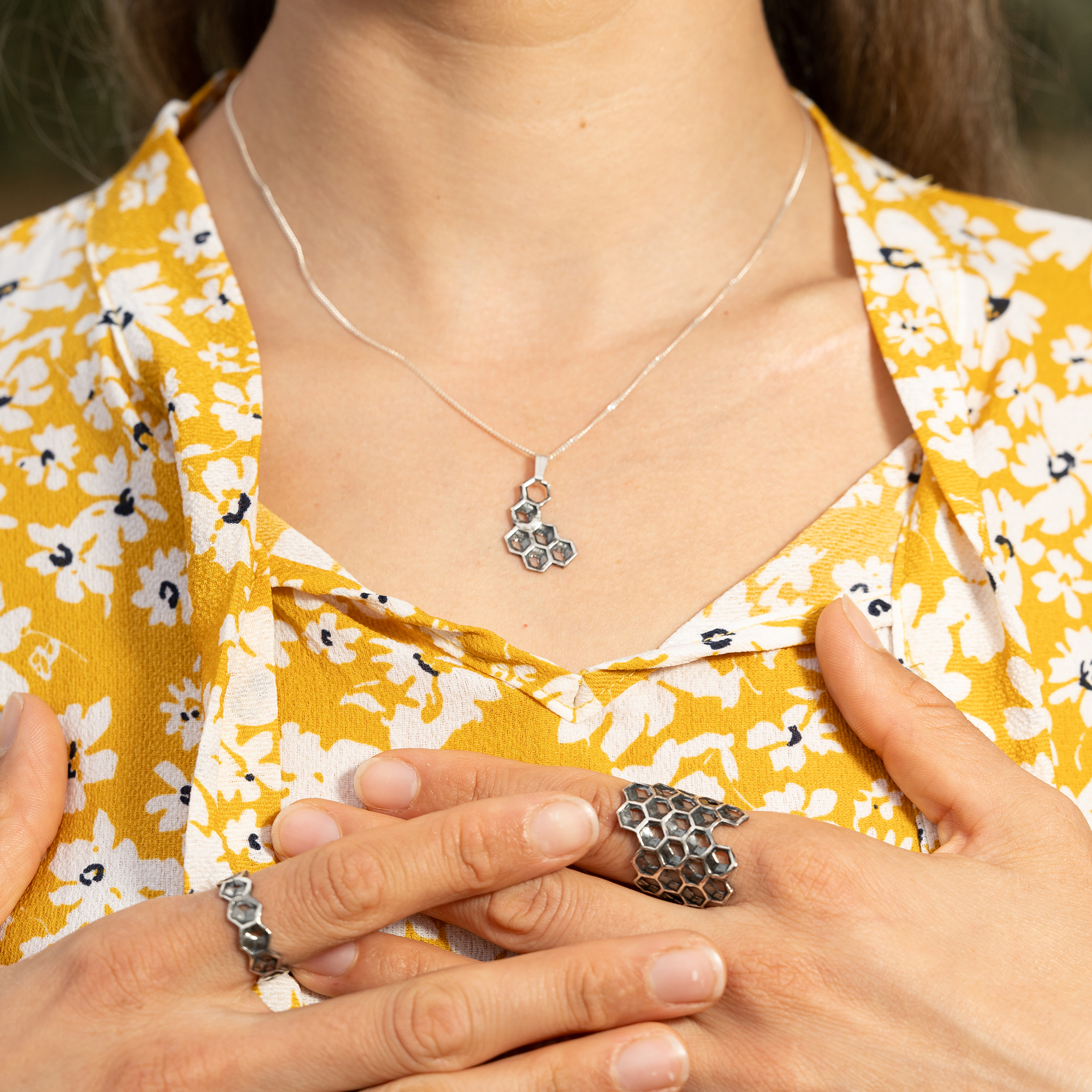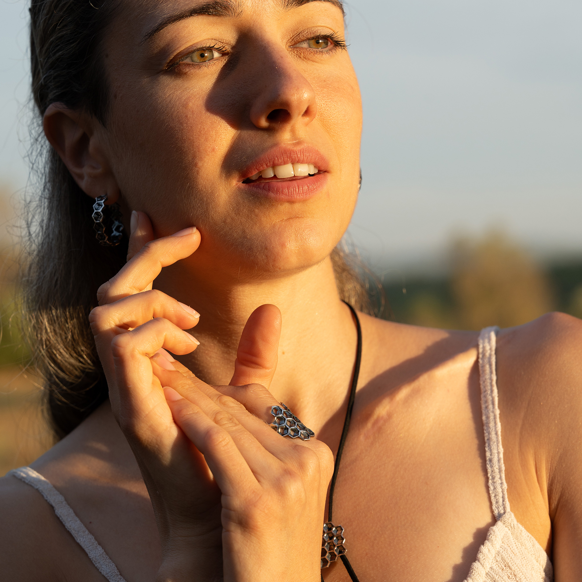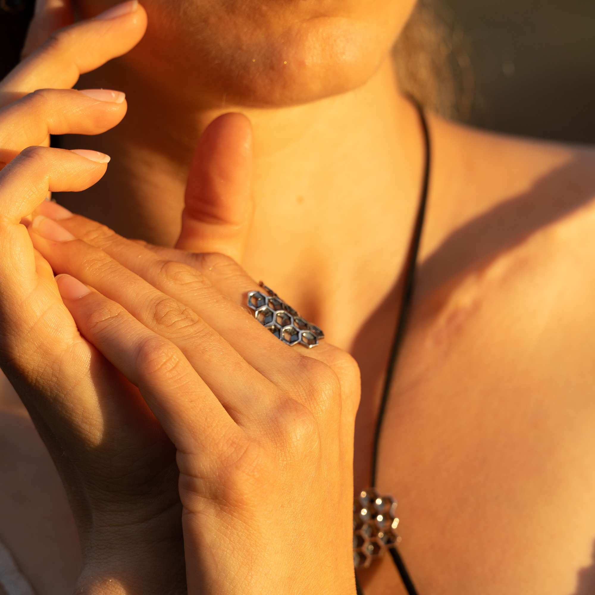 «Este anillo ancho de plata de ley rinde homenaje a la geometría perfecta del panal de abeja, un símbolo de armonía y equilibrio en la naturaleza. Su diseño envolvente y textura hexagonal crean un juego de luces y sombras que realza su belleza y carácter único.