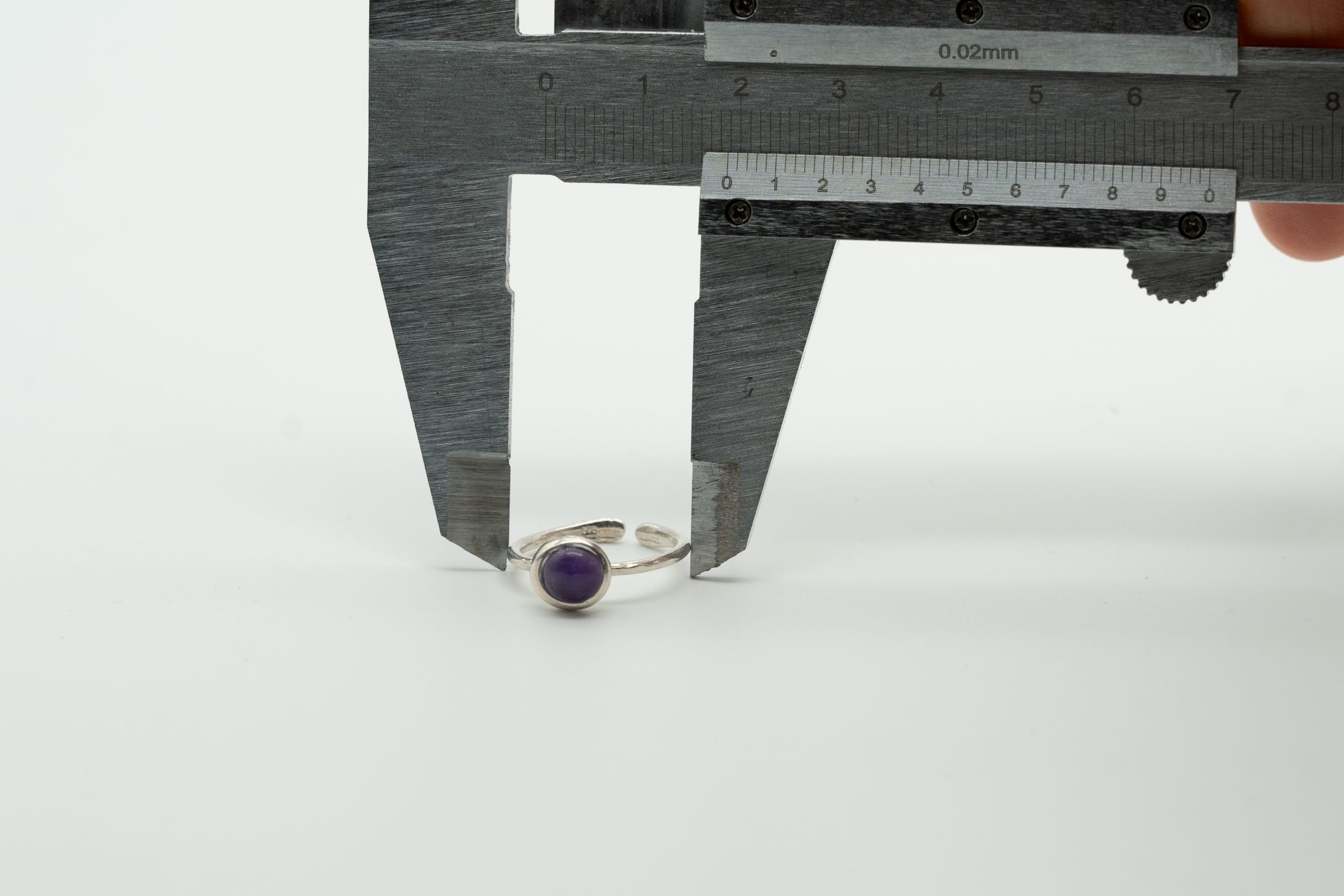 La pieza central mide aproximadamente 6 mm de diámetro. El anillo es ajustable, lo que permite adaptarlo cómodamente a diferentes dedos sin perder su forma ni estilo. Está hecho a mano en mi pequeño taller, utilizando exclusivamente plata de ley de origen sostenible.