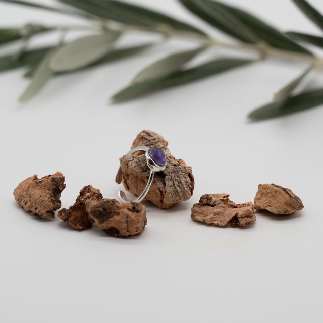 Cada anillo se completa con una piedra natural —granate, peridoto, amatista, citrino o lapislázuli— elegida por su belleza y carácter. Es una joya versátil, pensada para llevar todos los días o para regalar un detalle con alma.