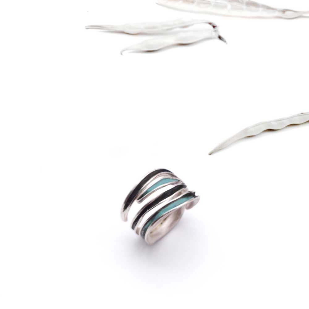 Anillo de Plata de ley con diseño irregular, de doble banda abierto, ajustable con un Detalle de color en su interior hecho con Esmalte Frío