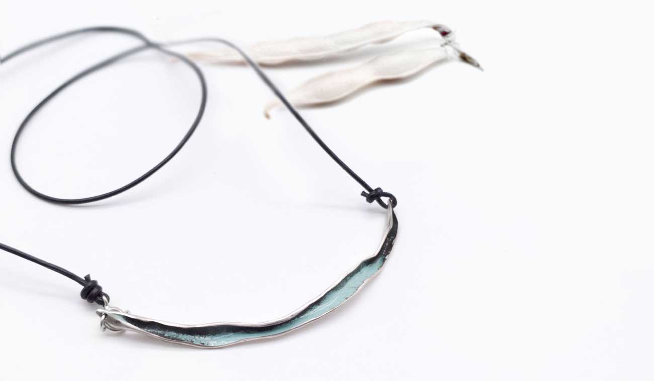 Esta gargantilla de plata de ley, hecha a mano en mi pequeño taller, combina artesanía, diseño orgánico y comodidad. Su colgante, con una forma irregular inspirada en las vainas naturales, refleja la belleza de lo imperfecto, con suaves curvas que realzan su carácter artesanal. En su interior, un delicado detalle de color, aplicado con esmalte frío, aporta un contraste vibrante y sutil, convirtiéndola en una pieza singular.