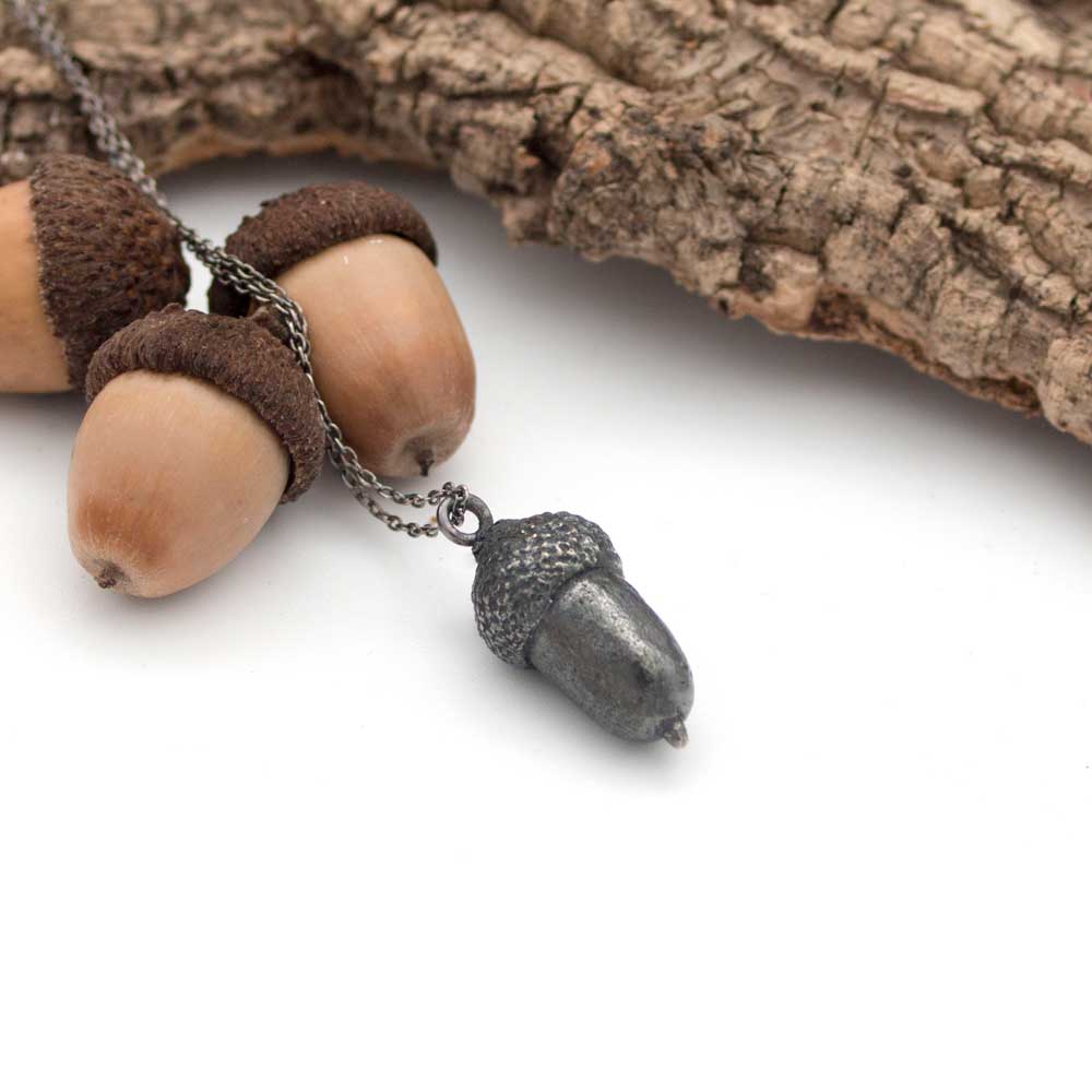 Collar con Forma de bellota. Colgante Hecha A Mano en Plata de Ley. Disponible en Plateado, Negro o con Baño de Oro amarillo de 24k .