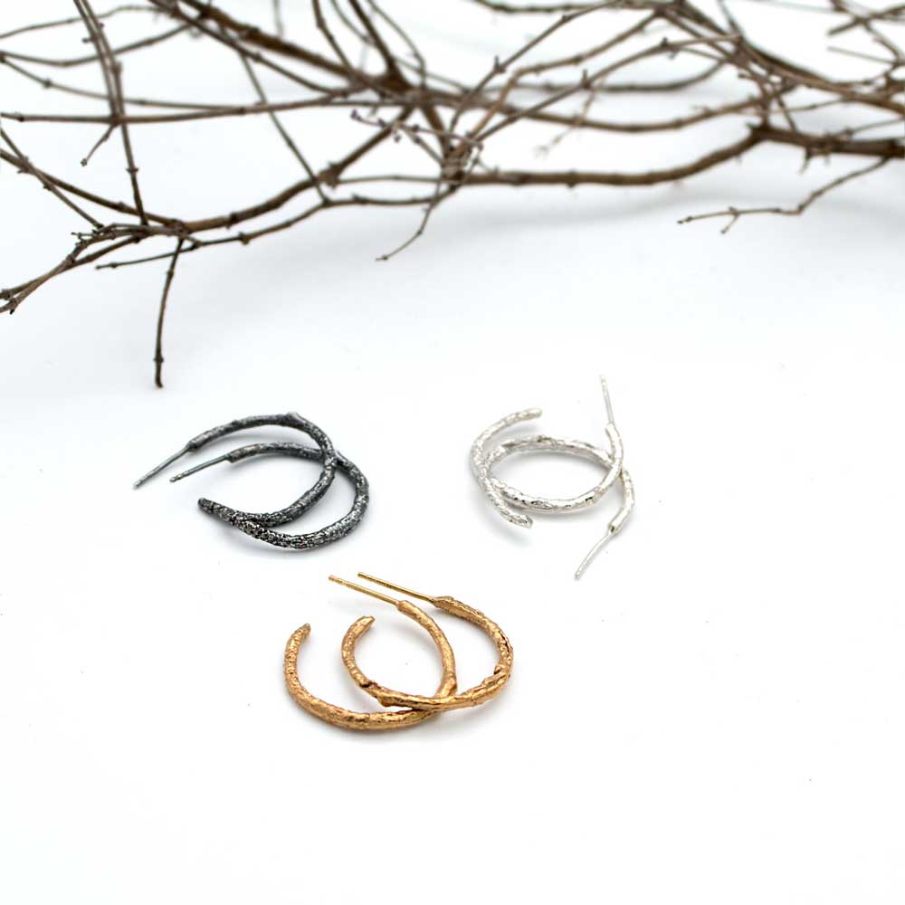 Pendientes De Aro Con Forma De Rama. Argollas Hechas A Mano En Plata De Ley. Disponibles En Plateado, Negro O Con Baño De Oro Amarillo De 24k .