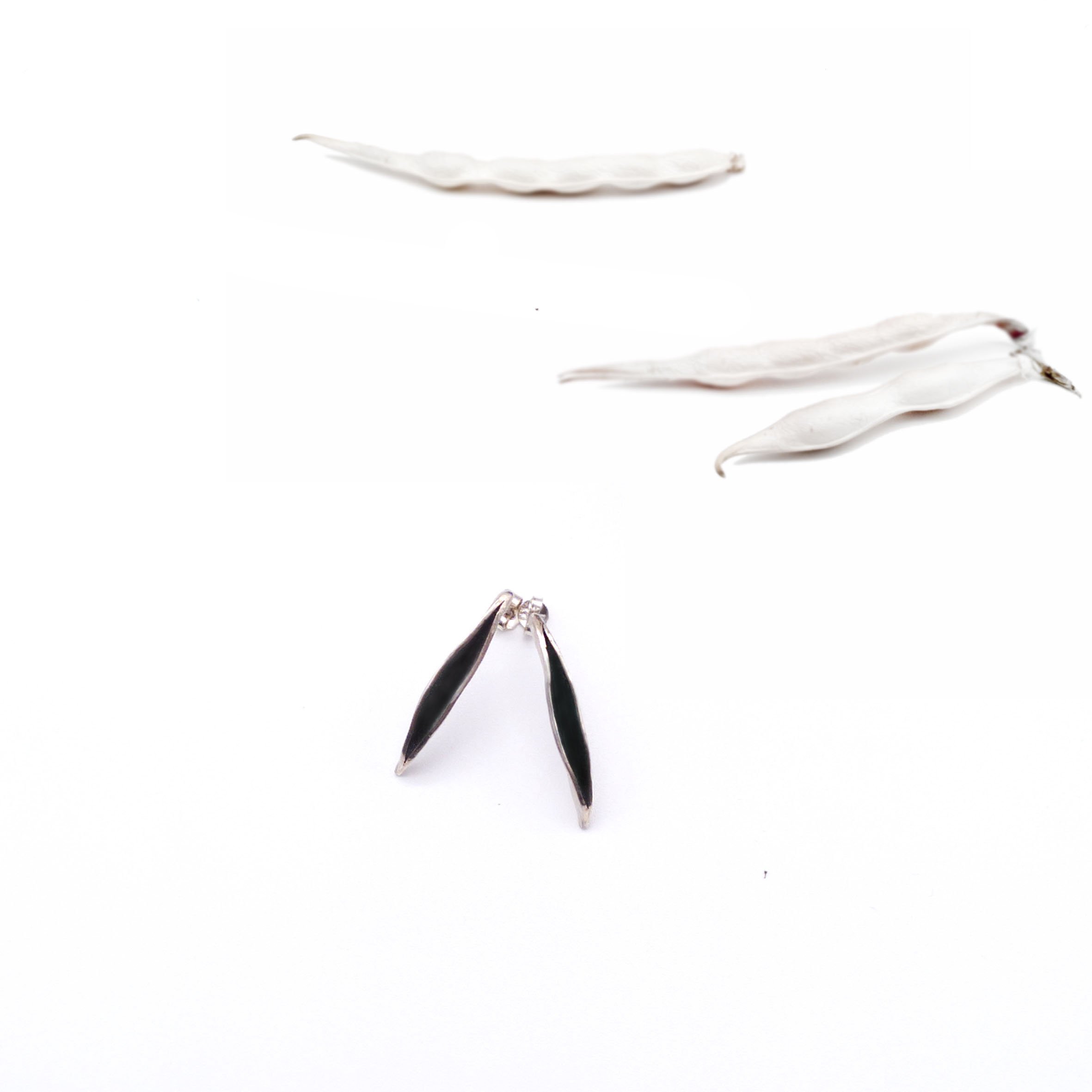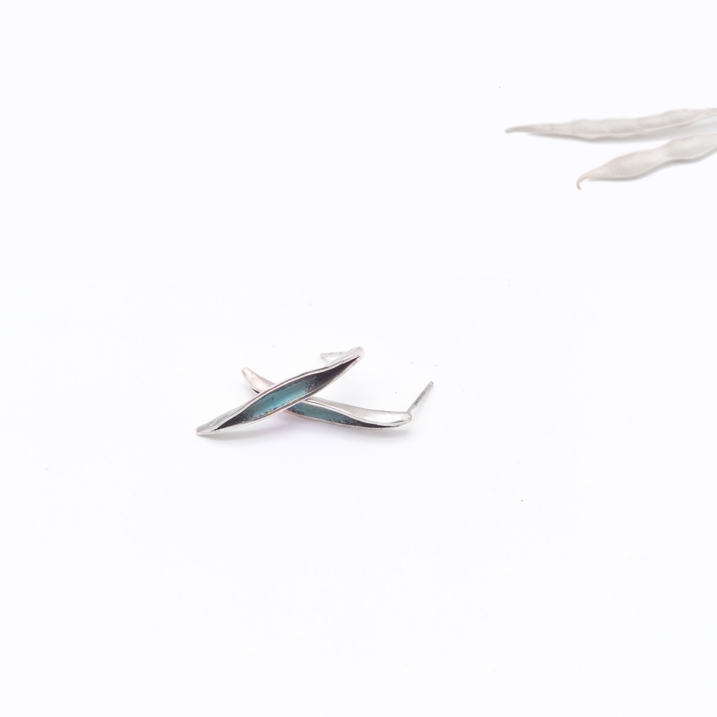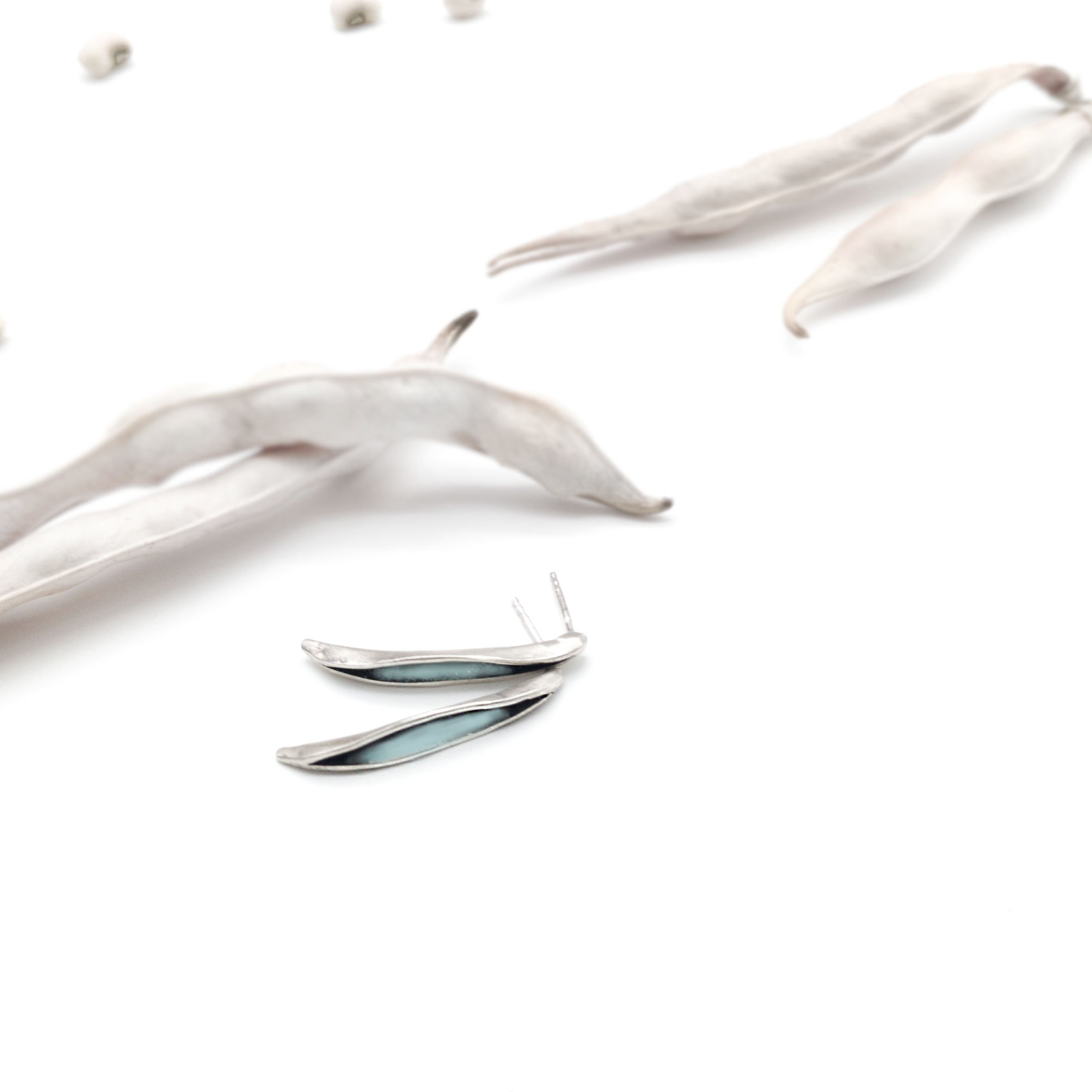 Estos pendientes de plata de ley, hechos a mano en mi pequeño taller, presentan un diseño vertical irregular con una forma única inspirada en una vaina, con un toque moderno y único. El cierre de presión asegura un ajuste cómodo y seguro, ideal para el uso diario o para ocasiones especiales. Cada pendiente está decorado con un detalle de color en su interior, logrado mediante esmalte frío, que agrega un contraste delicado y vibrante, realzando la belleza orgánica de la pieza.